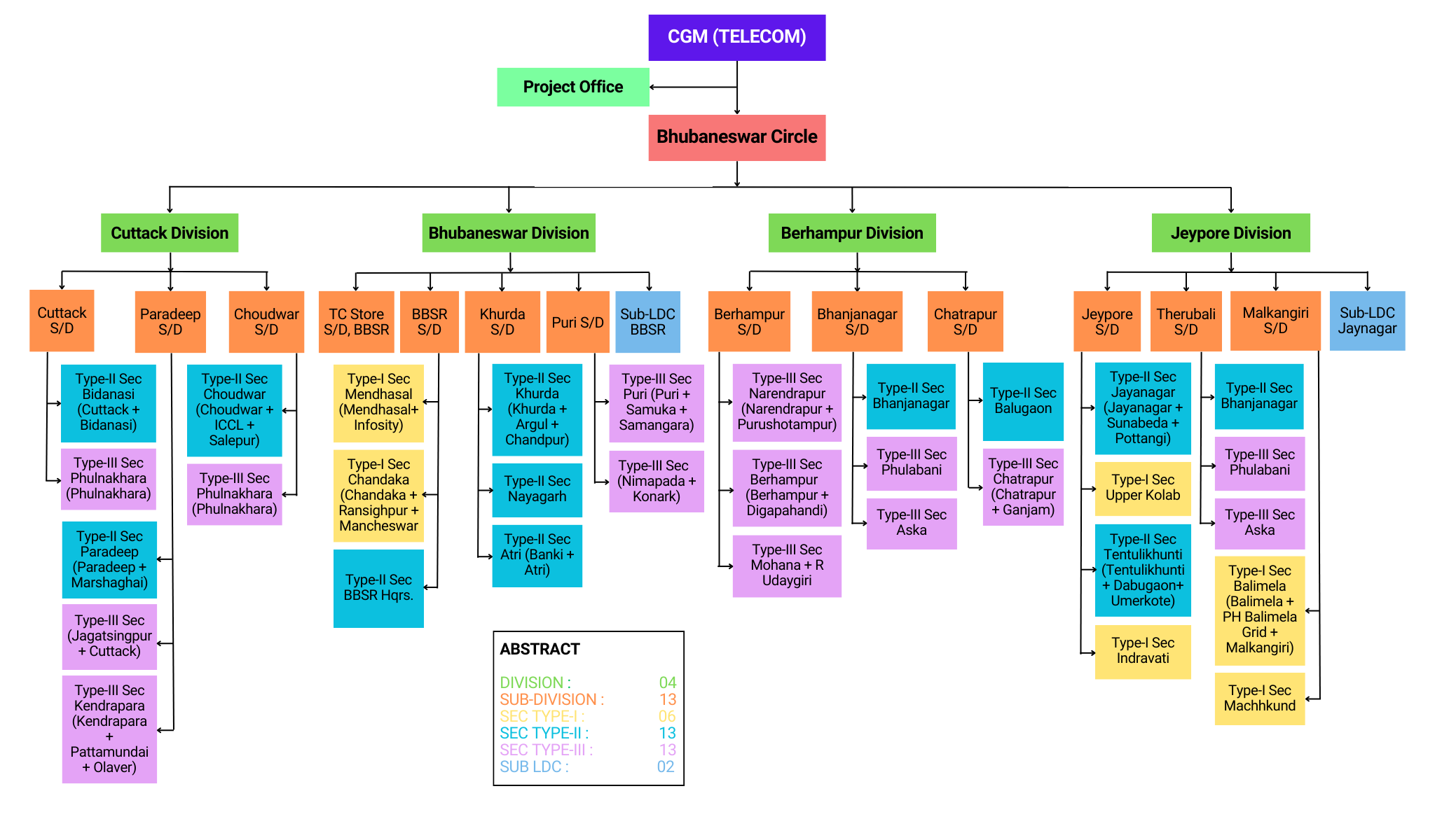 The Telecom wing, headed by C.G.M (Telecom) is having two Telecom Circles.